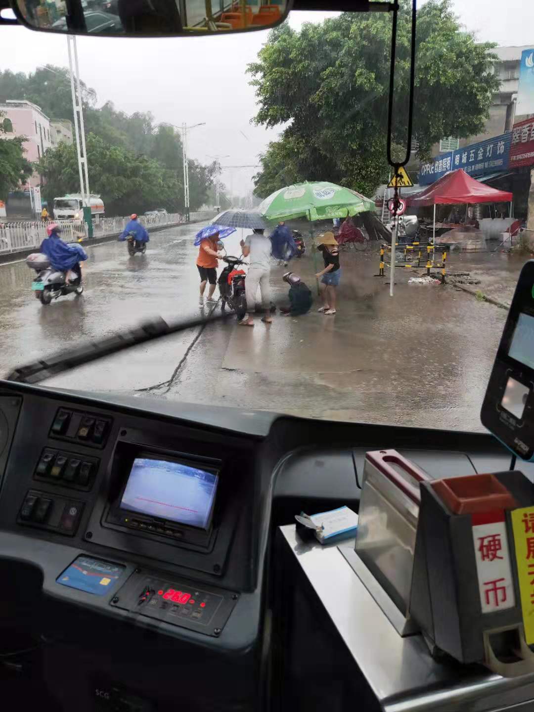 2019年8月1日,受台风“韦帕”的影响,茂名市雨势较大,民众冒雨出行。一名七十多岁的老人骑电动车经过公馆圩交叉口附近时,不慎摔倒在路边,电动车压在他的腿上,身体动弹不得,现场雨势风势较大,过往的车辆较多,老人的情况十分危险。当时,周春晓驾驶公交车刚刚看到老人倒地的一幕,职业的本能让他迅速将车辆停靠在离老人3米的安全范围内,打开双闪灯,用公交车为老人树起一道安全的屏障,预防过往的车辆对老人造成伤害。周春晓来不及和车内乘客做解释,就一个箭步跑到老人身边,搬开压在老人腿上的电动车。周春晓的举动得到了周围店铺主的积极响应,大家纷纷加入到救人行列中,为老人打开了大遮阳伞避雨、用红花油帮老人擦拭流血的腿,直到老人被抬上救护车,众人才离开现场。事后,老人的家属亲自致电到公交公司感谢周春晓。