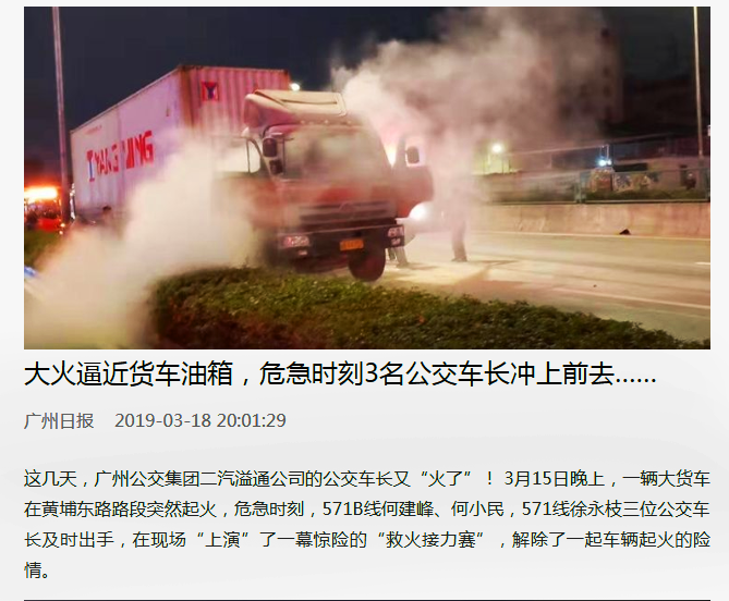 “公交车长救火我见过,但是看3名公交车长接力救火,我还是头一遭呢!”这儿说的3名公交车长便是广州公交集团二汽溢通公司571B线何建峰、何小民和571线徐永枝。