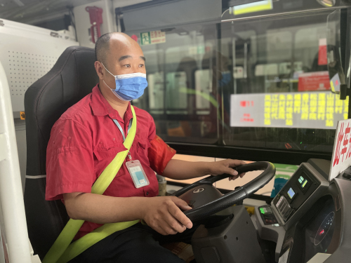 今年49岁的陈荣镜是广州巴士集团增城分公司一名14路线公交车车长。“五一”这天,陈师傅5时30分就来到了始发站增城客运站,“今天是举国同庆的日子,祝福家人朋友身体健康, 山河无恙。”说起今天坚守岗位,陈师傅表示,在这个美好的日子里,能为市民安全出行出一份力,自己也挺开心的。说着,陈师傅便开始打扫卫生、检查车辆,按上级防疫措施要求落实做好消毒保洁工作,6点正准时从增城站出发,开始这一天的工作。
