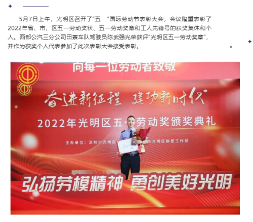 安全行车万里 爱洒十米车厢——西部公司三分公司驾驶员陈武强荣获“光明区五一劳动奖章”