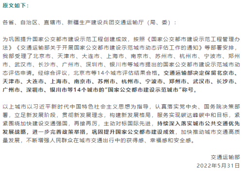交通运输部保留广州、深圳等14个城市“国家公交都市建设示范城市”称号