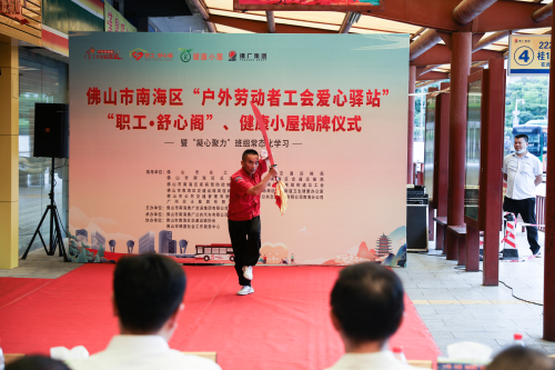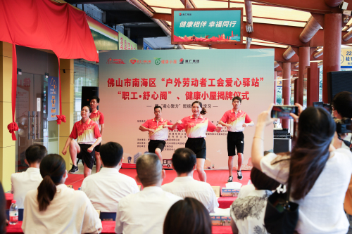 紧接着,活动进入了今天最重要的一个环节。佛山市总工会党组副书记、常务副主席蒋庆、佛山市交通运输局党组成员、副局长庄儒耀、佛山市南海区总工会党组成员、副主席沈海泱、佛山市南海区交通运输局党组成员、常务副局长孔小虎、广州巴士集团有限公司副总经理王军、佛山市南海区疾病预防控制中心健康教育和科教信息股股长温彩银、佛山市公共交通管理有限公司党总支书记、南海分公司总经理陈鹏凯、佛山市南海区桂城街道总工会副主席朱秀娟、佛山市南海区交通运输协会会长、佛山市南海佛广交通集团有限公司党总支部书记、总经理陈清华、佛山市南海区交通运输局桂城交通服务所所长谭伟龙共同为“户外劳动者工会爱心驿站”、佛山市南海区“职工·舒心阁”和“健康小屋”进行揭牌,开启幸福时刻。