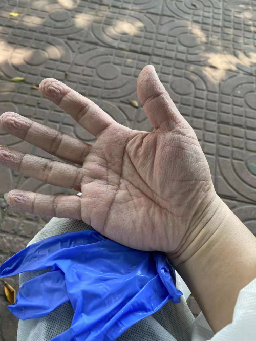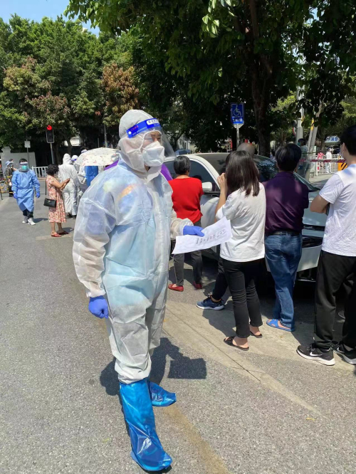 到达支援地后,袁讯立刻穿戴好防护服,迅速投入到支援工作中,现场帮助居民扫核酸码、登记信息、维持秩序......这些工作对于多次参与防疫志愿服务的他来说,一切都太熟悉了。天气很热,防护服很闷,脱下手套的那一刻,袁讯才发现手掌早已被汗水浸泡得皱巴巴的,但他乐呵呵地表示:“能为广州市疫情防控贡献自己的一份力,我很开心。我是党员我先上,疫情不退,我必在岗!”