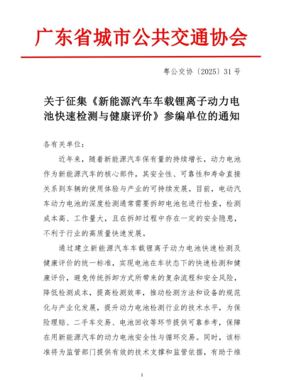 关于征集《新能源汽车车载锂离子动力电池快速检测与健康评价》参编单位的通知