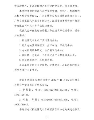 本次标准由新能源汽车行业运营商、主机厂、检测机构及相关科研院所倡议,广东省城市公共交通协会提出并归口,广州公交集团汽车服务有限公司、深圳普瑞赛思检测科技股份有限公司牵头多方单位组织开发。