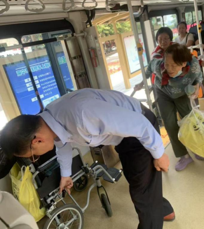 此时,车内的乘客们也纷纷投来关切的目光,耐心等待驾驶员协助老人乘客搬运轮椅。只见张云锦弯着腰、弓着身子,小心翼翼地抬起轮椅,稳稳地将其搬上公交车。待老人由陪同家人搀扶上车后,张云锦又细心地将轮椅固定好,一边叮嘱对方坐稳扶好,一边询问其下车站点,以便下车时再次提供帮助。