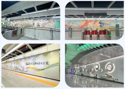车站文化墙融合了地域特色,展现曲海龙舟、大朗毛织、荔香荔园、松山湖科学城等东莞标志性元素,以艺术笔触,生动呈现各镇街的历史底蕴与现代活力,让乘客在出行中感受湾区文化韵味。