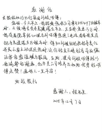 2025年12月7日,如约出行集团广交分公司收到市民程先生的一封感谢信,对出租车驾驶员刘姣拾金不昧迅速送还自己价值二十多万元名贵手表的善行,再三致谢与点赞。