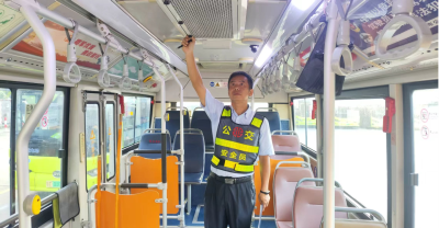 图为中山公交集团安全员检查车辆标识与设施