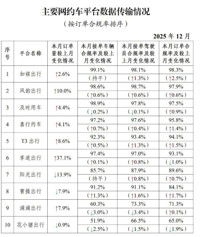 一、在订单量前10名的平台中,按订单合规率(指驾驶员和车辆均获得许可的订单量占比)从高到低分别是如祺出行、风韵出行、及时用车、喜行约车、T3出行、享道出行、阳光出行、曹操出行、滴滴出行、花小猪出行。本月订单合规率增长前3名的依次是如祺出行、曹操出行、T3出行;增长最后3名的依次是滴滴出行(0.1%)、享道出行(-1.0%)、花小猪出行(-1.9%)。