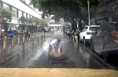 在反复确认井盖已完全盖合、路面隐患彻底清除后,王斌借着雨水清洗掉手上的污泥后,简单地整理了一下身上的衣服,便返回至驾驶位。坐在车厢后排的乘客看到了这一幕,为这名“的哥”见义勇为的善举大力点赞。